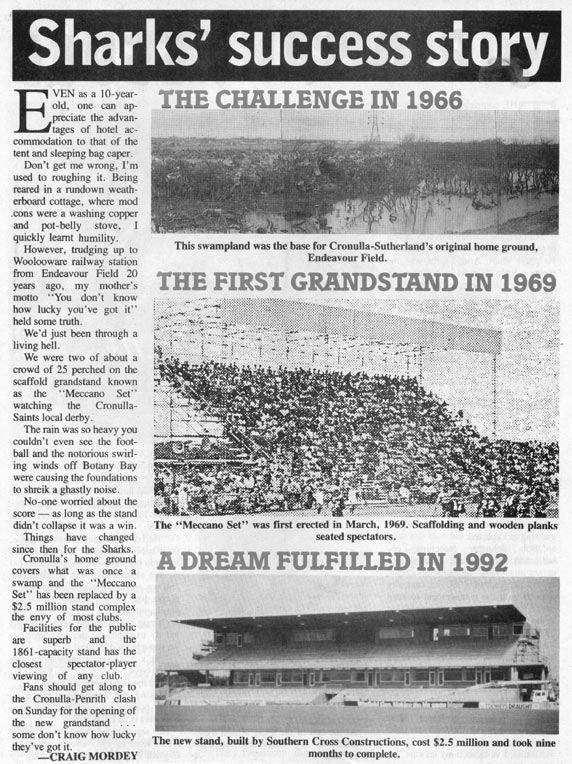In 1992 the Cronulla club extended their ground at Endeavor Field, adding a new stand to the ground at a cost of 2.5 million dollars[3]. The club originally calling the stand the 'Western Endeavour' grandstand but with the retirement of Andrew Ettingshausen in 2000 the club decided to name it the 'Andrew Ettingshausen' stand in his honour.