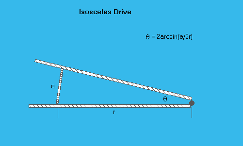 A simple single-arm barn door tracker can be made by attaching two pieces of wood together with a hinge. A camera is mounted on the top board, usually with some sort of ball joint to allow the camera to be pointed in any direction. The hinge is aligned with a celestial pole and the boards are then driven apart (or together) at a constant rate, usually by turning a threaded rod or bolt. This is called a tangent drive.[1] This type of mount is good for approximately 5-10 minutes before tracking errors become evident when using a 50mm lens. That length of time can be increased to about 20 minutes when using an isosceles mount.[2] A curved drive bolt in lieu of either a straight tangent or isosceles mount will greatly extend the useful tracking time.