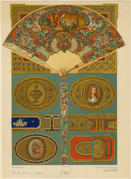 [French design patterns.] Printed on border: "Pl.XCVI" Figures numbered 1-14. Firmin-Didot (Firm), printer; Durin, F., lithographer. Published in 1873. From NYPL Picture Collection.