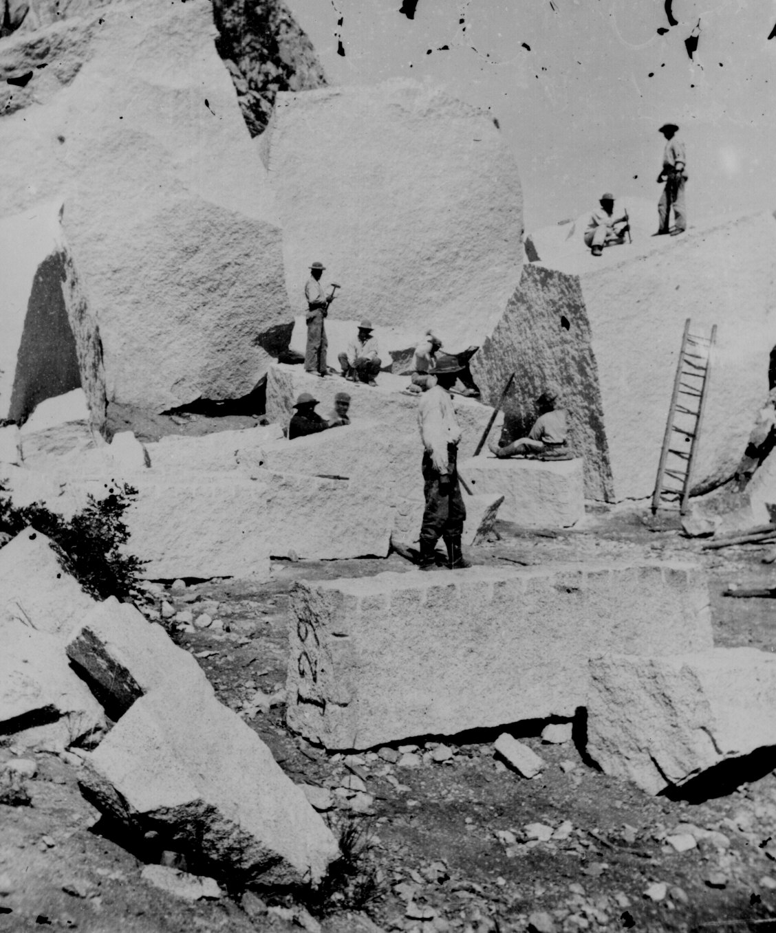 Quarrying granite for the Mormon Temple, Utah Territory. The ground is strewn with boulders and detached masses of granite, which have either fallen or have been hewn from the walls of Cottonwood Canyon. The quarrying consists of splitting up the blocks.