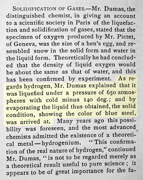 The first liquefaction ( in 1898 ) and solidification ( in 1899 ) of hydrogen is credited to Dewar. However this account from Eclectic Magazine, June, 1878 would indicate this had been accomplished by others 23 years earlier. — The preceding unsigned comment was added by Boborama (talk • contribs) 02:59, 13 April 2007 (UTC).