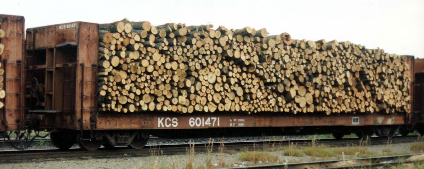 Kansas City Southern Railway #601471, a bulkhead flat car, carries a load of pulpwood.