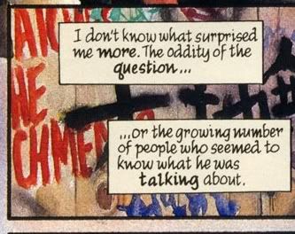 Alan Moore's "Watchmen" is referenced in issue 1. When Norman McCay walks by a collectibles store, "Under the Hood" by Hollis Mason is featured in the shop's window. Also Rorschach is seen in the Meta Human Bar. [IMG]http://i293.photobucket.com/albums/mm78/ct_avery/Rorschach.jpg[/IMG] In an early panel a graffiti covered wall has the tale end of the infamous 'Who Watches the Watchmen?' grafitti. [IMG]http://i293.photobucket.com/albums/mm78/ct_avery/WATCHMEN.jpg[/IMG]
