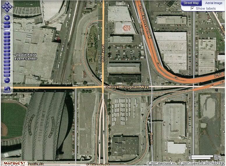 - To the side of the new Qwest Field running up 4th Avenue S., there was an entrance to eastbound Interstate 90, but it has been demolished and a replacement constructed a quarter mile south (made up from the newly constructed Edgar Martinez Way S. south of Safeco Field). The western terminus of I-90 still stands right next to where the ramp stub of the former eastbound on-ramp, though new railroad tracks now cover where the ramp was[21]. The former configuration can still be seen here but now looks like this.