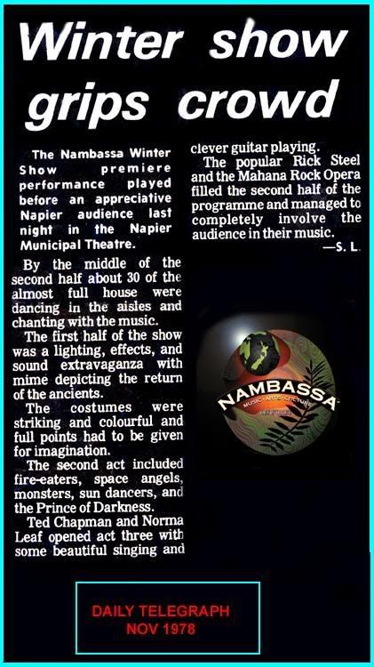 The Nambassa Winter Show with Mahana was all about a bunch of aspiring young hippie entertainers who moved into a youth camp in west Auckland out of which this community of 60 people produced and directed two musical theatrical productions and toured the North Island of New Zealand in a convoy of Mobile homes, buses and vans, performing at major centres and theatres throughout September and October 1978. While initially 4 main shows were schedule for this collective theatre company, repeat and spontaneous performances around the nation saw this number of live performances increased to over 10. This theatrical extravaganza was organised by the Nambassa Trust as part of its national promotion of the arts and towards promoting its 1979 3 day music, crafts and Alternative lifestyle festival which was held in Waihi attracting 70,000 people.[1] .[2]