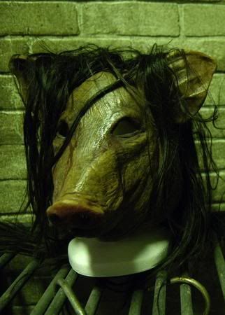 Production photo and screenshot from Saw III, showing the pig mask. |