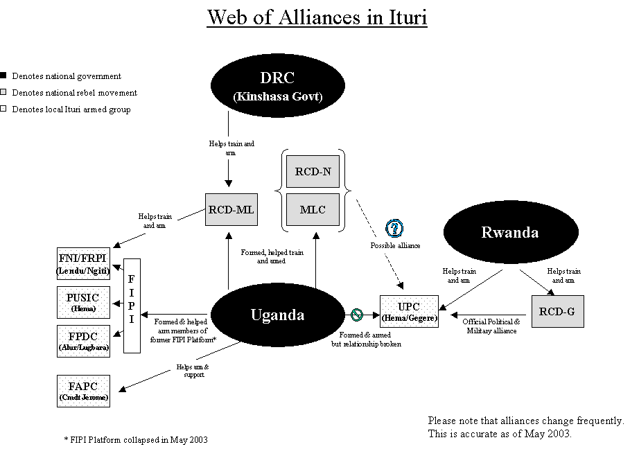 - The map on page five of the ICG report "Scramble for the Congo" is incredibly good in showing the rough area held by various forces in 2000 but it gives credit to IRIN, where I can't find it and figure out if there's a copyright BanyanTree 19:17, 7 Dec 2004 (UTC)