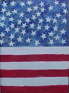 BELOW:This is an AMERICAN flag studey painting created by signaturex in 2003. It measures 7 by five feet and is construncted from wood, canvas, and oil paint. There are 50 small swasticka like shapes that are visable when studying the relief of the artwork at very close range. When first viewing the shapes they are percieved as swastickas but upon close examination the viewer can discern that the shapes actually have one leg turned back. The true origin of the shape is a television screen born image that appears when the artists Nintendo brand video game malfunctions.