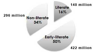 In some South Asian countries, such as India and Pakistan, Same Language Subtitles (SLS) are common for films and music videos. In India, 84% of people are early- or non-literate.[6] With SLS, "[r]eading becomes automatic, subconscious, in everyday entertainment."[7] SLS are karaoke-style subtitles, "highlighted in perfect timing, as they are sung [or spoken]. This association of the spoken and written word is a proven method to improve reading skills."[8]