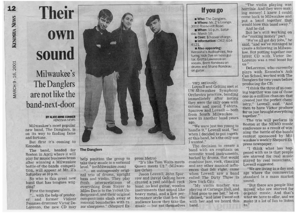 The Danglers are a U.S. experimental and progressive rock band formed in Milwaukee in 1997. Described as a "surreal mix of musical mix and medieval manners," [1], this one-of-a-kind original trio of electric violin, standup bass, and drums includes John Sparrow of the Violent Femmes on drums/percussion, Jason Loveall of the Tossers on violin/guitars/vocal and Dave Gelting on bass.