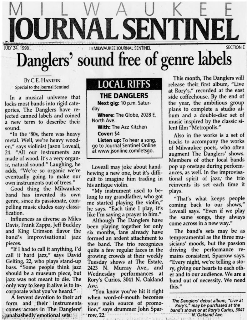 "Simplicity is necessary to create good music," Jason Loveall said in a 2002 interview with The Press. Yet, it is a blend of "pocket symphonies, orchestral rock with contrasts of cacophony and quietude, harsh astringency and cotton softness," [2] that makes The Danglers' music original and "sexy cool".[3] Self-proclaimed Heavy Wooden because their instruments are made of wood, their first release was a hand-copied cassette called 'Live at Rory's', a stereo mic recording of an early show at the venue that launched the band.